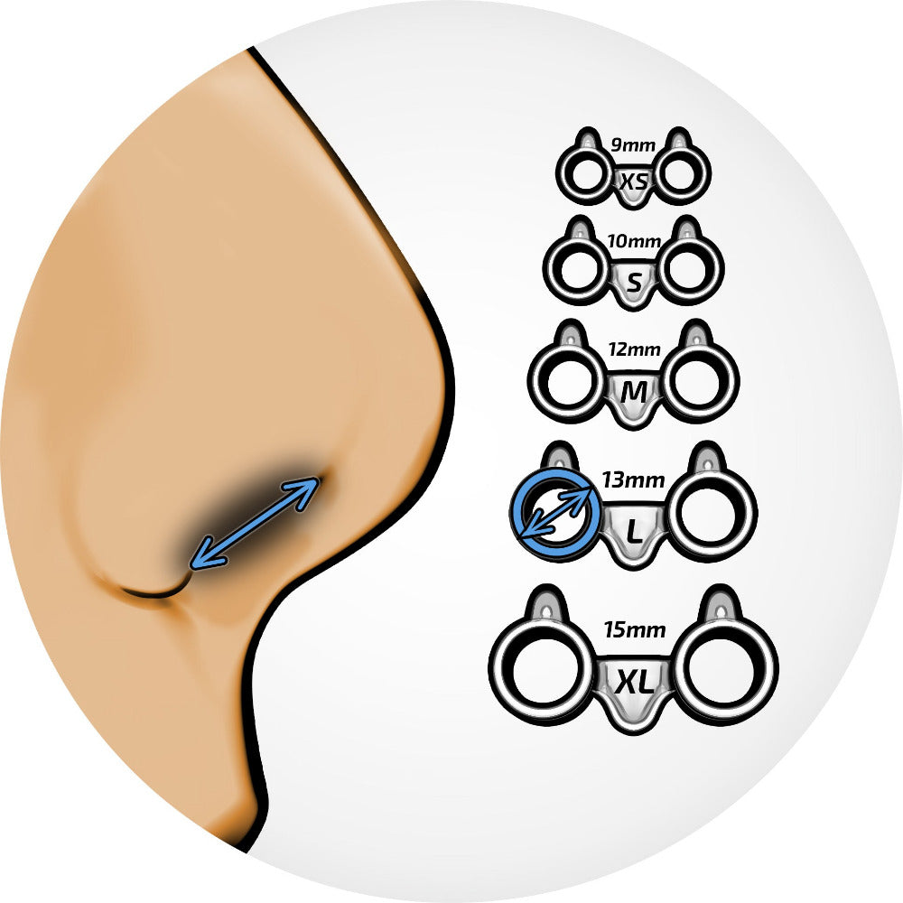 So findest du ganz einfach die passende Größe: Miss den Innendurchmesser deiner Nasenlöcher – einmal waagerecht, einmal senkrecht. Addiere beide Werte und teile das Ergebnis durch zwei. Dann vergleichst du den Wert mit unserer Größentabelle.